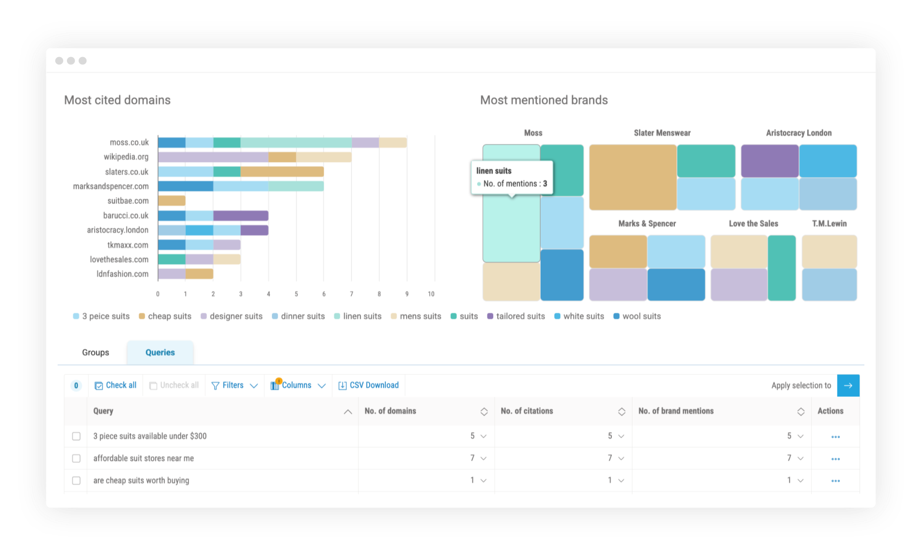 Strong site performance doesn’t tell the whole story. Who is talking about your brand, and in what context? We expose brand mentions within LLM content, connect them to cited content and domains, and evaluate sentiment in context. Brand sentiment can be benchmarked against any other brands appearing in the same query content, offering a complete view rather than isolated signals.