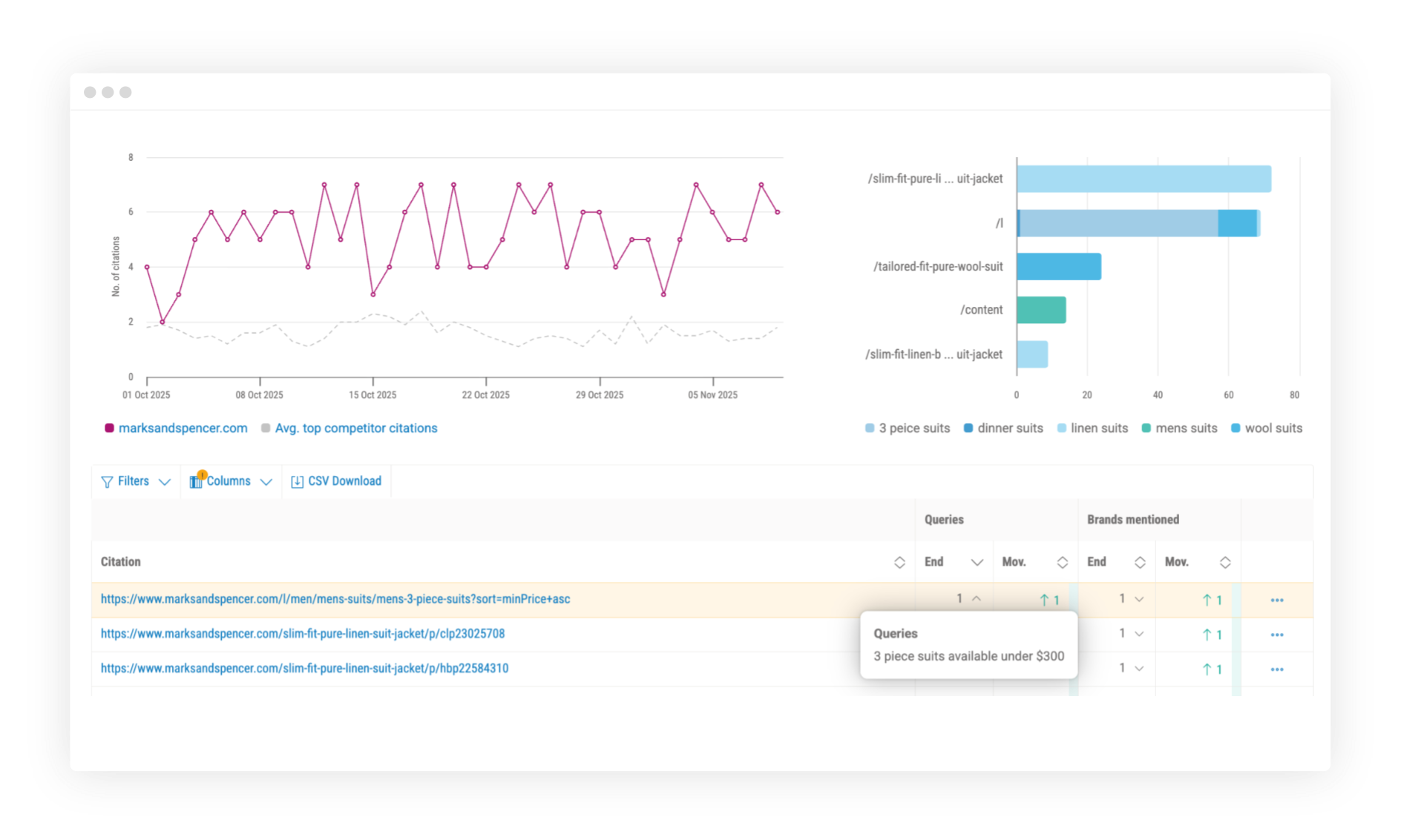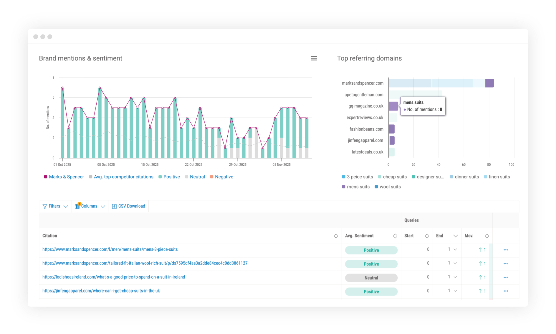 Strong site performance doesn’t tell the whole story. Who is talking about your brand, and in what context? We expose brand mentions within LLM content, connect them to cited content and domains, and evaluate sentiment in context. Brand sentiment can be benchmarked against any other brands appearing in the same query content, offering a complete view rather than isolated signals.