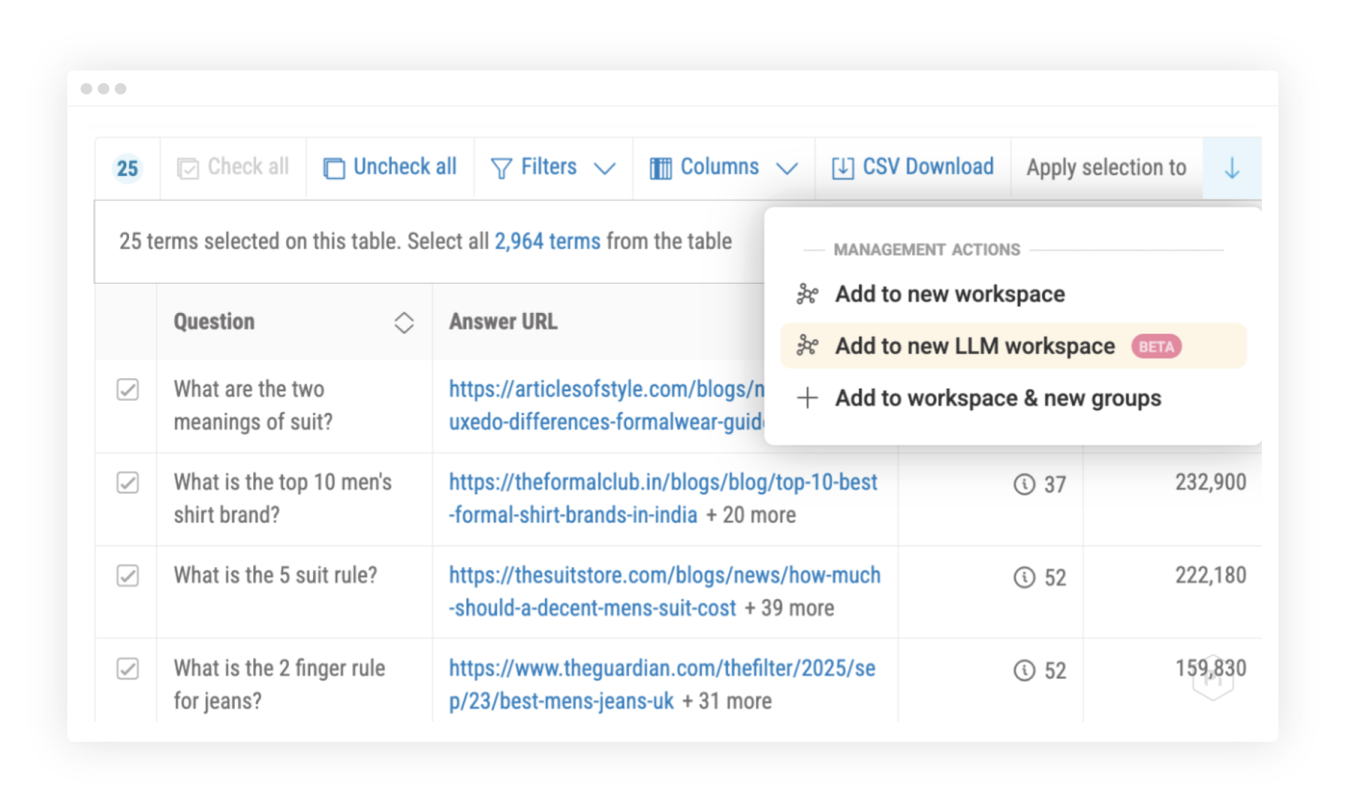 Conversational LLM queries can be surfaced topically from SERP data. This connects topical demand to natural-language query patterns and completes the view of how real searchers explore a topic.
