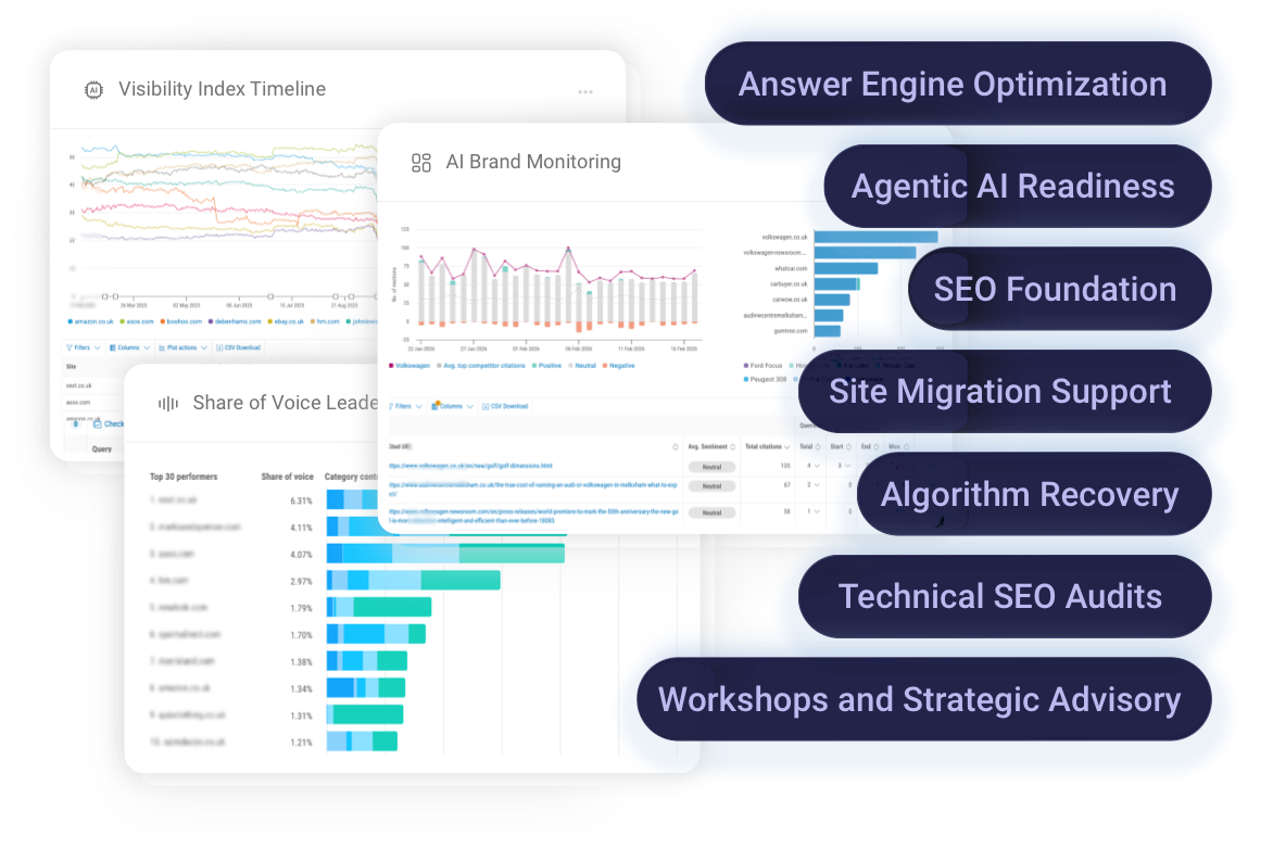 These services form a progression across modern search. SEO builds visibility and authority in traditional search. AEO strengthens conversational presence across AI-generated search environments. Agentic readiness prepares brands for AI-assisted decision and transaction experiences. Together they ensure visibility from discovery through to decision.